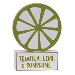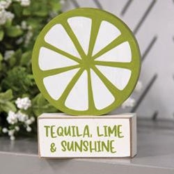 The Tequila Lime Sunshine Sitter is a decorative wooden block with a white painted finish and green lettering, reading “Tequila, Line & Sunshine”. The block is finished with a green and white wooden lime slice on top for a fun and colorful stacked style. The block displays freestanding, perfect for dressing up a bar area or kitchen with a summery accent. Measures 4.25” high by 3” wide by 1” deep.