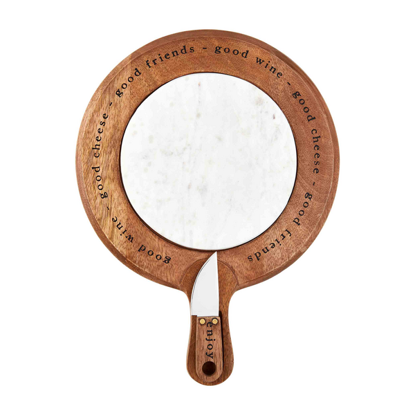 Make time for good wine, good cheese and good friends with our Marble Inset Cheese Board Set. The three piece set comes with a mango wood paddle board. The paddle board features a removable marble inset. The inset features a magnetic handle to hold included cheese knife in place.